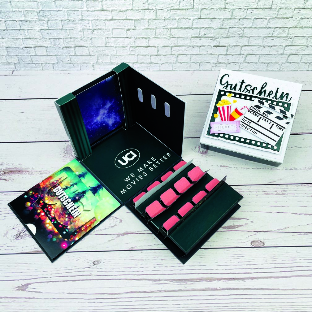 Material: Cardstock 250gsm in Weiß, Lineal, Bleistift, Flüssigkleber, doppelseitiges Klebeband, Schere oder Hebelschneider, Falzbrett und Falzbein, ggfs. einen 3D Embossingfolder eurer Wahl, Dekomaterial & Stanzen je nach Thema, hier "ATC Cinema Set 6 x 9" (Craft & You) sowie die Stanze "Filmklappe" (Joycrafts). Bühne und Sitzreihen sind von Mediendesign Moser.