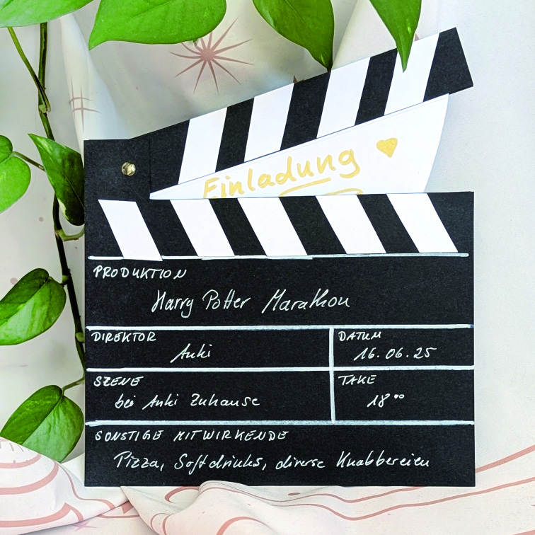 Ein Filmabend alleine macht nicht annährend so viel Spaß wie mit Familie oder Freunden. Doch eure Wunschgäste müssen auch erfahren, dass ihr sie in eurem Heimkino begrüßen möchtet. Deshalb hat Anke für euch eine Einladungskarte in Form einer Filmklappe gebastelt. Eine Schritt-für-Schritt-Anleitung findet ihr ebenfalls im Magazin.