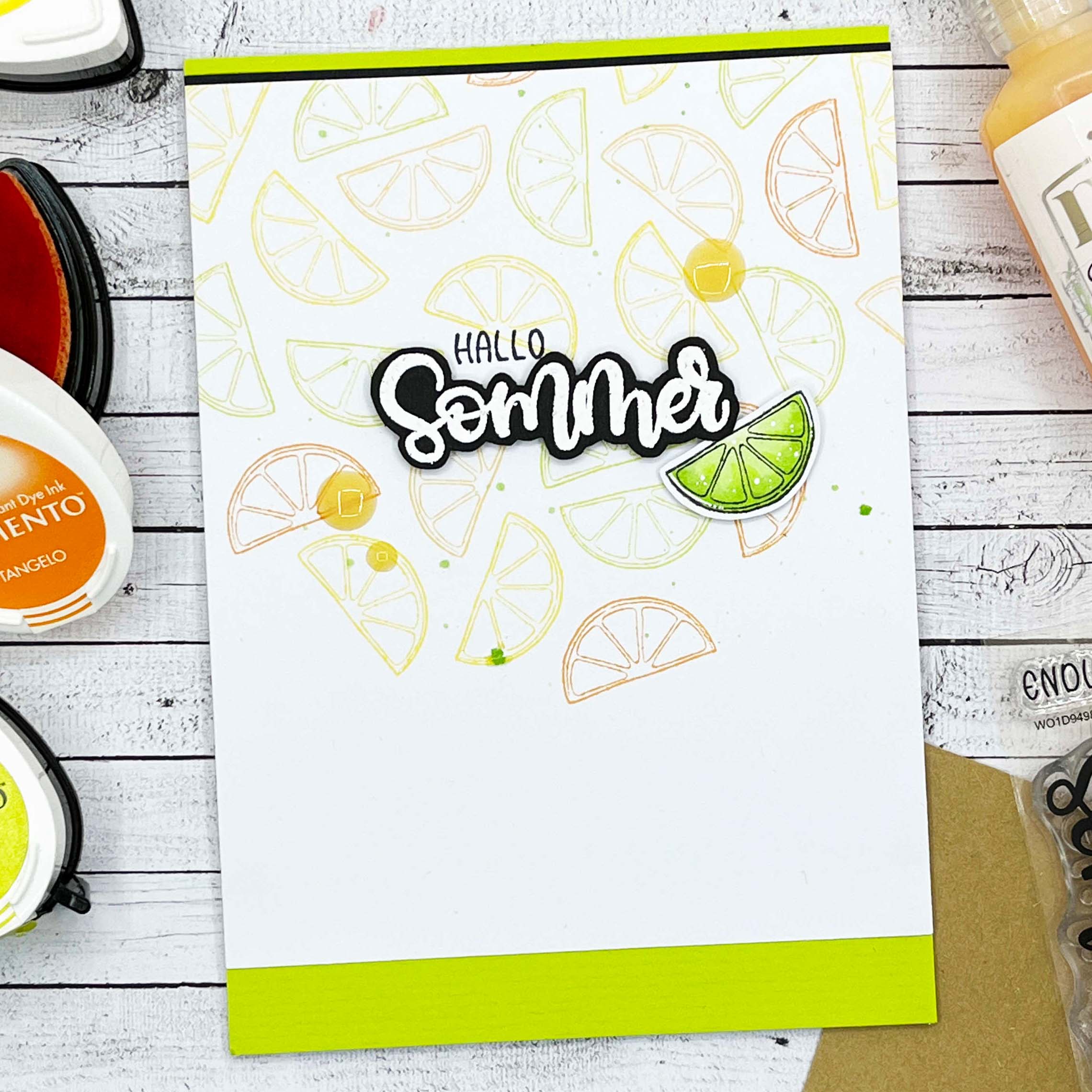 Türchen Nummer 1 hat bei Lisa (@catsndcrafts) gleich jede Menge Inspiration losgetreten – zum Beispiel die Idee für diese schnelle sommerliche Karte. Für den Hintergrund hat sie sich Zitronen, Limetten und Orangen aus dem Stempelset "Coole Socke Fips" (Artikel Nr. 00091471) ausgeliehen.