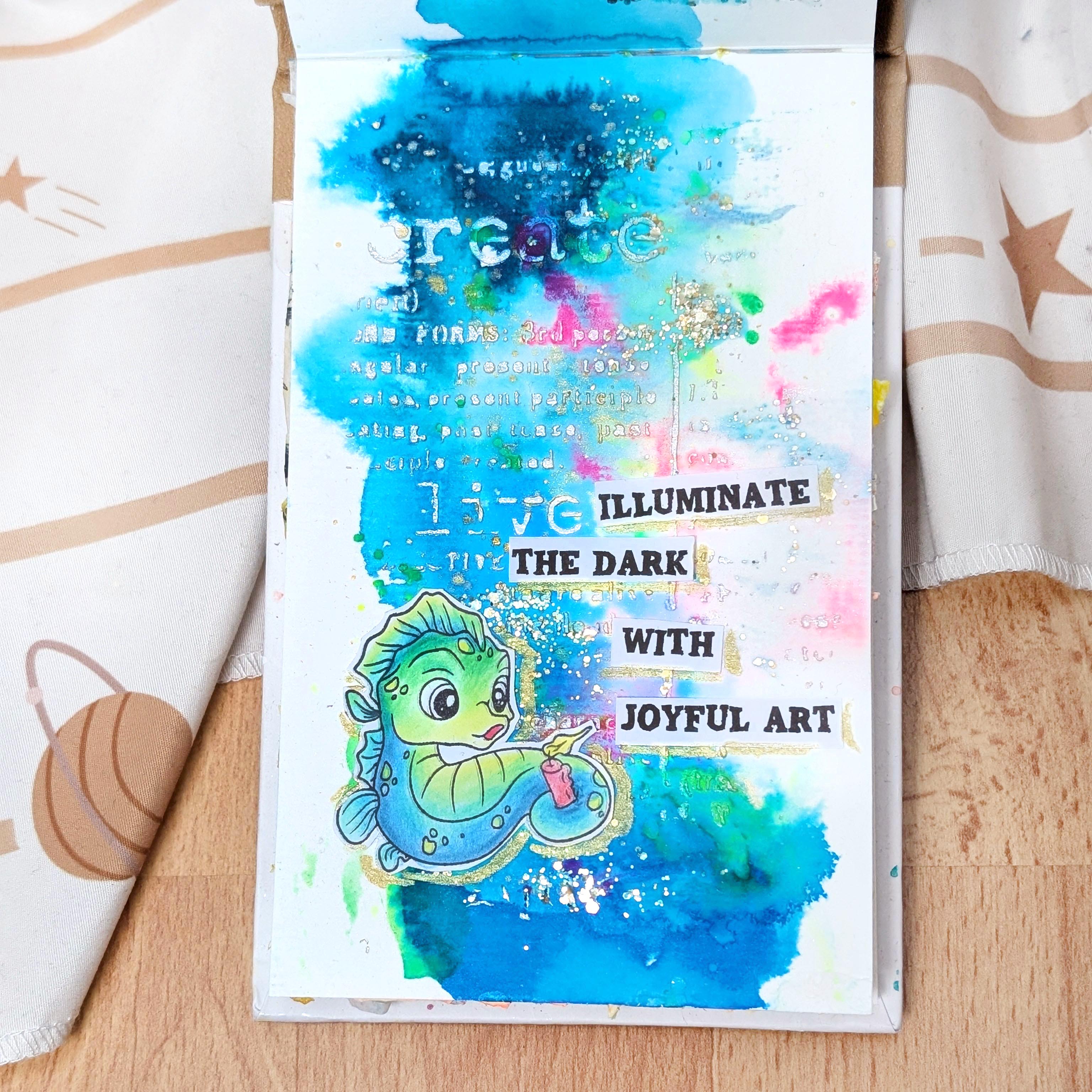 Jetzt in den grauen Wintertagen kann etwas mehr Farbe nicht schaden. Deswegen hat sich Anke (FB: Zwischen Farbe und Wort) eine aufmunternde Art Journal Seite kreiert. Dazu hat sie sich dem goldigen Seepferdchen aus dem zweiten Adventskalender-Türchen (Artikel-Nr. 00117820) ein paar Aquarellfarben und einem schönen Spruch aus dem Sticky Quotes Collector's Book (Artikel-Nr. 00107448) von StudioLight bedient. mit ein wenig Glitter-Acrylfarbe (DecoArt) bekommt die Seite noch ein schönes Funkeln.
