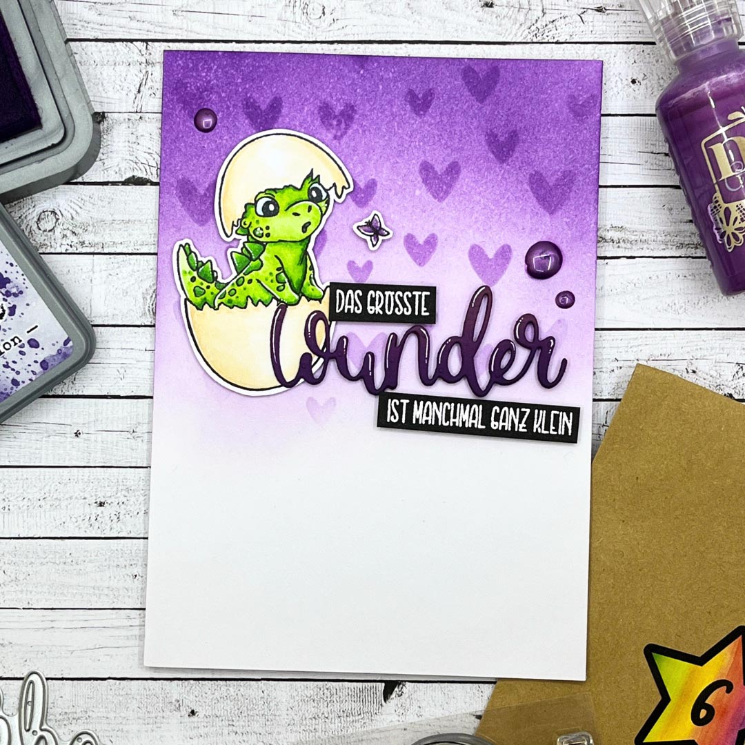 Lisa (@catsndcrafts) hat das Dino-Baby aus Türchen Nr. 6 in eine Eierschale gesetzt und damit eine süße Babykarte gezaubert. Die Stempel- und Stanzsets "Layered Wunder" (Artikel Nr. 00113455) und "Lettering Wunder" (Artikel Nr. 00113454) ergänzen das Motiv perfekt.