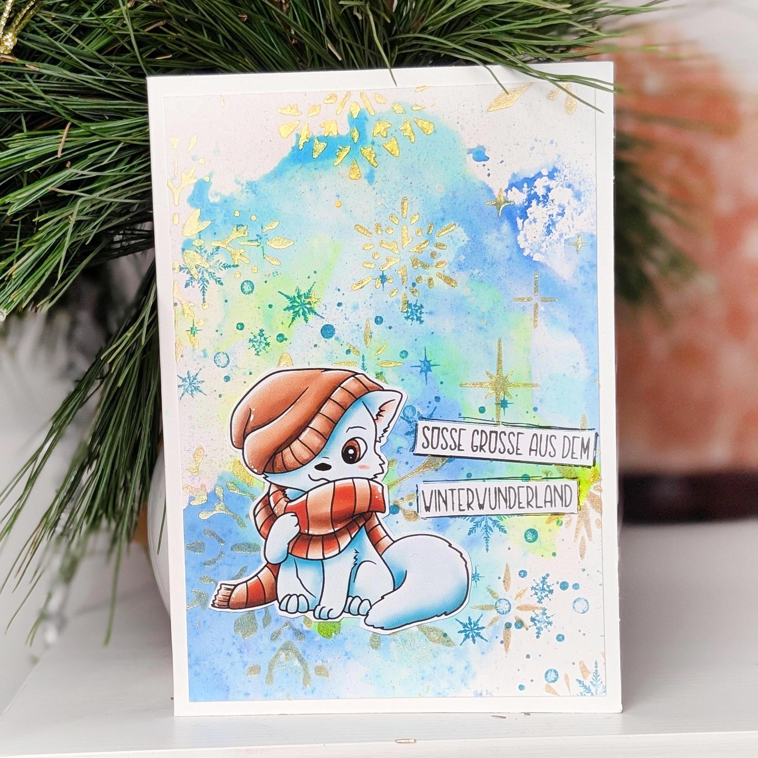 Passend zur süßen Polarfüchsin Auri (Artikel-Nr. 00121721) hat Anke (FB: Zwischen Farbe und Wort) im Hintergrund ein Schneegestöber geschaffen. Zum einem mit dem Schneestempel aus dem heutigen Adventskalender-Türchen (Artikel-Nr. 00117820), zum anderen mit Schablone und Halo Paste (Artikel-Nr. 00096565) auf einem Aquarelluntergrund. Noch eine kleine Botschaft dazu (Artikel-Nr. 00121723) – fertig.
