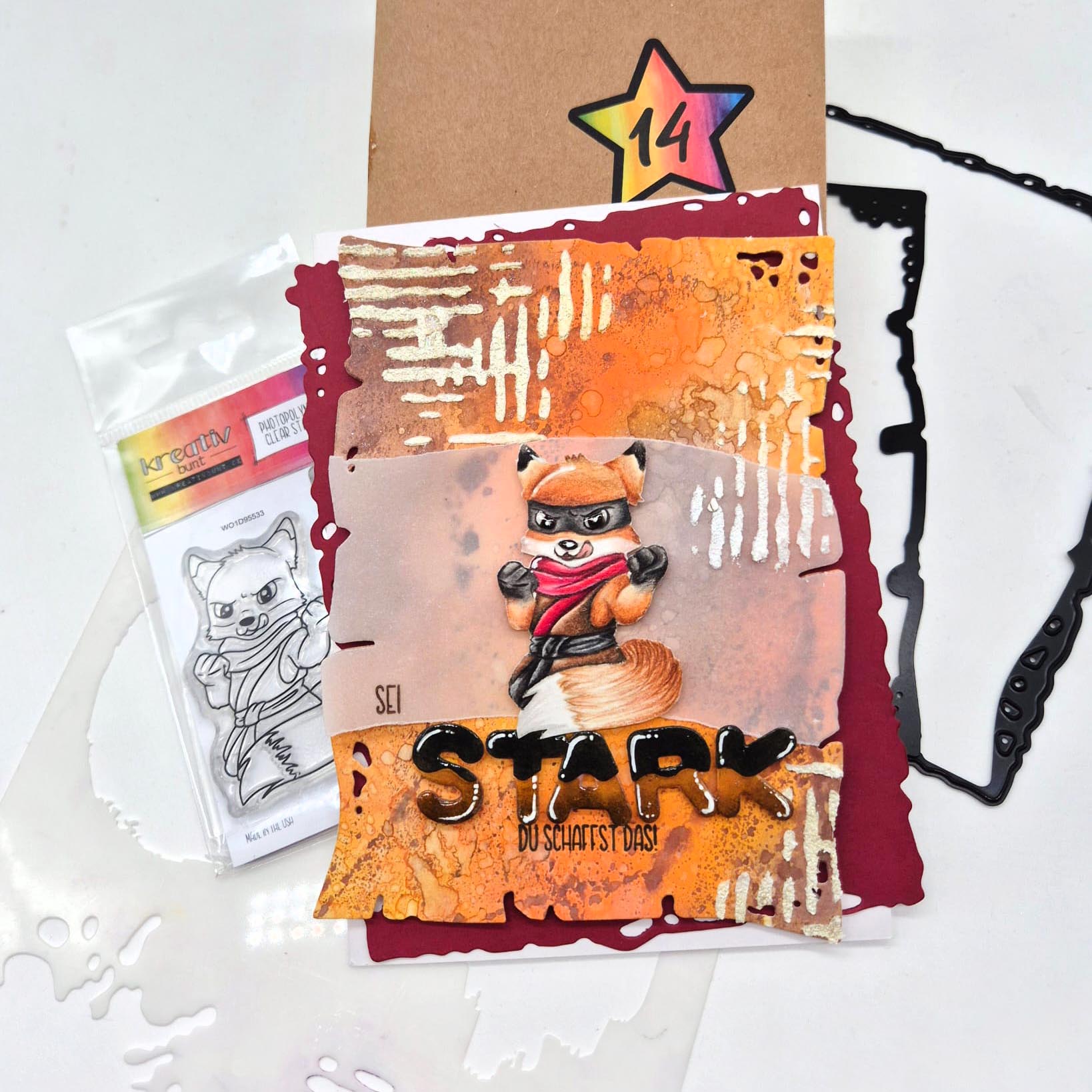 Sei stark!!! Cindy (@shadowschatti) hat das heutige Türchen für eine fantastische Mut-Mach-Karte genutzt. Coloriert mit Polychromos (und angelehnt an einen Ninja Fuchs strahlt die Karte einfach Pure Power aus. Die Streifen der Schablone „Kreative Hintergründe“ (Artikel-Nr. 00101098) wurde mit "Texture Paste" (Artikel-Nr. 00022603) aufgetragen, die zuvor mit ein bisschen Puder der "Perfekt Pearls Confetti White" (Artikel-Nr. 00017226) gemischt wurde.