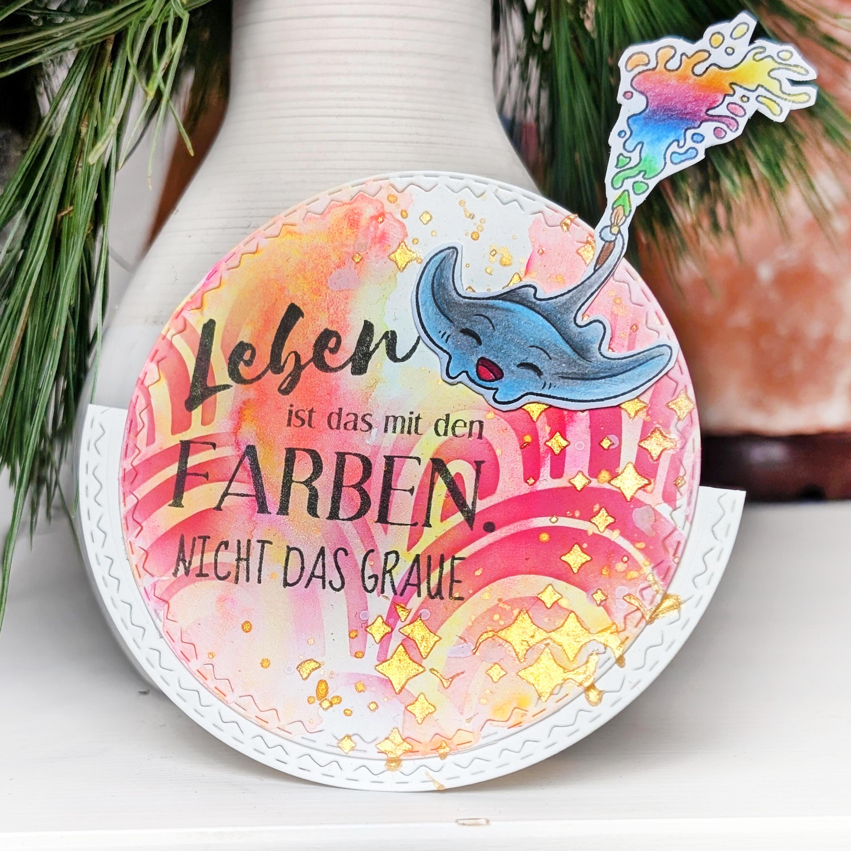 Eine runde Sache ist diese aufmunternde Schaukelkarte. Hier hat Anke (FB: Zwischen Farbe und Wort) den goldigen Rochen aus dem heutigen Adventskalender-Türchen (Artikel-Nr. 00117820) verwendet, der Farbe in das Leben des Empfängers bringt. Im Hintergrund lockern Aquarellfarbe, Schablonenmotive (Artikel-Nr. 00121122) und Halo Paste (Artikel-Nr. 00096565) die Gestaltung auf.