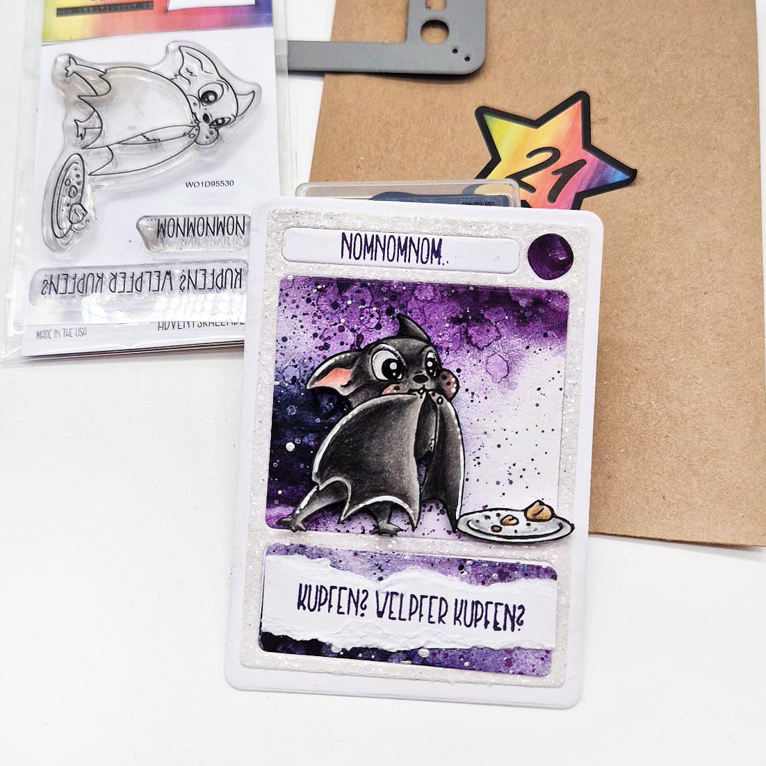 Cindy (@shadowschatti) hat sie gefunden, die höchst seltene Kuchen-Dieb-Fledermaus. Mit Polychromos coloriert ist die Fledermaus auf der "Artist Trading Card" Stanze (Artikel-Nr. 00117669) der Star.
