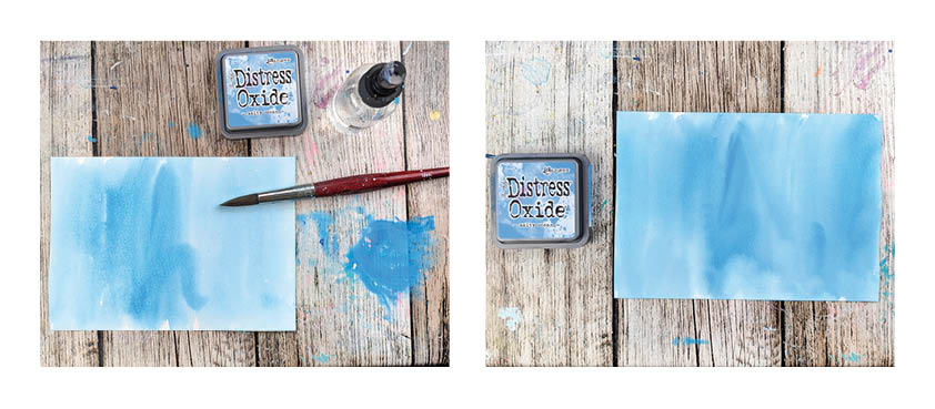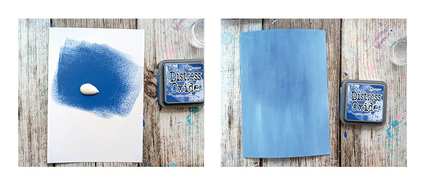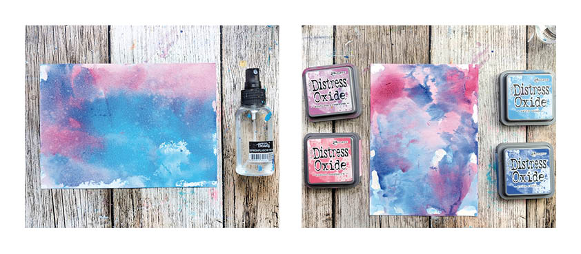 Die Distress Oxide Inks von Ranger erfreuen sich nach wie vor große Beliebtheit. Für viele Kreative ist das Wischen der Farben bekannt, ebenso die Verwendung mit Schablonen oder das Spritzen mit Wasser über die Farbe. Doch da die Stempelkissen sehr gut mit Wasser reagieren, gibt es noch zahlreiche andere Anwendungsmöglichkeiten. Anke zeigt euch in diesem Artikel, was ihr noch alles Spannendes mit den Distress Oxide Inks machen könnt.Der Klassiker. Mit einer entsprechenden feinen Bürste (auch Brush genannt) oder einem Verblender (Blending-Tool) könnt ihr eure Wunschfarben verblenden. Ihr nehmt mit eurem Werkzeug Farbe aus dem Stempelkissen auf und wischt vom Rand eures Papiers die Farbe. Eigentlich ist es auch egal, welches Papier ihr nehmt, es sollte jedoch keine zu glatte Oberfläche haben (wie z.B. Fotopapier oder YUPO Papier), denn wenn ihr mit Wasser arbeitet, muss das Papier dieses aufsaugen können. Cardstock oder Aquarellpapier eignen sich ganz gut dazu.