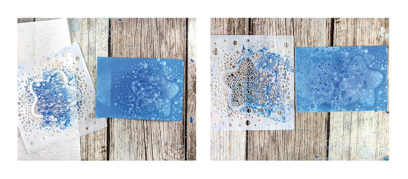 Ihr werdet bestimmt noch etwas Farbe an der Unterseite der Schablone haben, da etwas von dem Sprühwasser darunter gelaufen ist. Wischt es nicht einfach weg, sondern drückt es auf ein anderes Papier eurer Wahl, um auch das mit etwas Textur zu versehen.