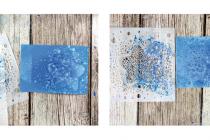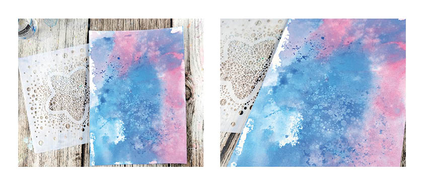 Um eure einfarbigen Hintergründe etwas aufzuhübschen, legt eine Schablone darauf und übersprüht beides mit Wasser. Lasst es kurz einwirken und tupft es mit einem trockenen Tuch ab. Hebt die Schablone vorsichtig ab. Nun solltet ihr eine hübsche Struktur erhalten, die das Motiv der Schablone andeutet. Das funktioniert am besten, wenn die Stempelfarbe im Untergrund nicht verdünnt, also recht viel Farbe zum Abnehmen vorhanden ist.
