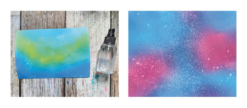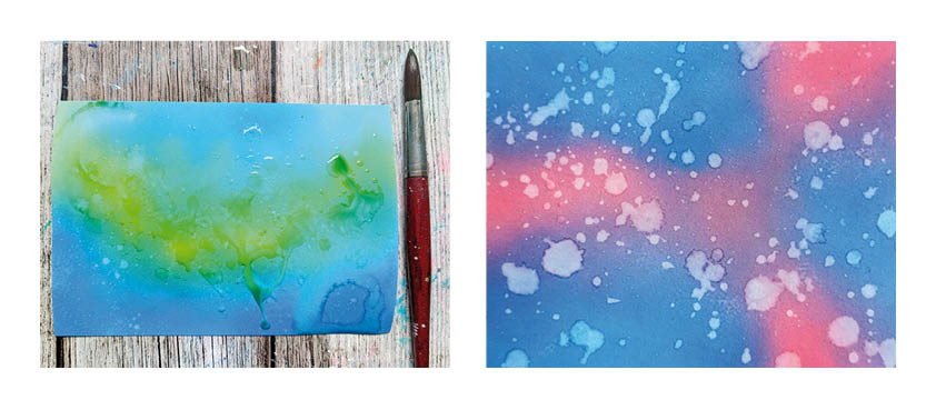 Mit einer Sprühflasche könnt ihr tolle Effekte erzielen. Je weiter ihr sie vom Papier weg haltet, umso feiner die Sprenkel.
