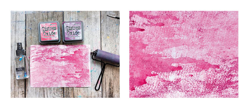 Mit einer Rolle (auch Brayer genannt) könnt ihr tolle Texturen schaffen. Rollt dafür über das Stempelkissen bis die Walze voller Farbe ist und rollt diese dann auf eurem Papier ab. Wer schon einmal mit der Gelli Plate gearbeitet hat, wird diese Prozedur kennen. Übrigens: Eine Gelplatte ist auch ein guter Untergrund, um die Distress Oxide Inks zu verflüssigen.