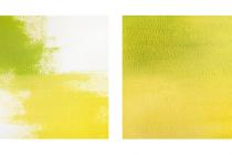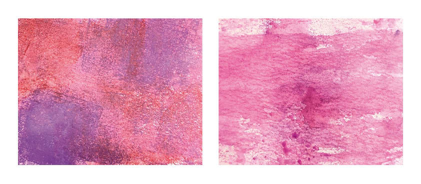 Diese Technik geht auch gut mit zwei Farben. Ist Farbe an eurer Walze übrig, könnt ihr diese mit Wasser besprühen und auf einem separaten Blatt abrollen. Das ergibt einen schönen Aquarelleffekt (rechtes Bild).
