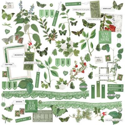 Die Kollektion "Color Swatch" von 49 and Market ist eine Serie mit verschiedenen Farben mit Schmetterlingen, Etiketten, Pflanzen und Rahmen. In diesem Fall ist die Hauptfarbe ein gedecktes Grün.