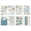 Eine niedliche Babykollektion für Jungen in Blau-, Grün- und Brauntönen mit einer Menge Muster, Spielzeug und Babysachen.