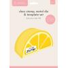 Schablonen zum Erstellen von Boxen in Fruchtform. Passend dazu enthält das Set Stanzen für die Details der Box. Zur Verwendung der Stanzen wird eine Stanzmaschine (bspw. Sizzix BigShot) benötigt. Außerdem sind drei passende Spruchstempel enthalten. Bei den Stempeln handelt es sich um Clear Stamps, die sich ohne weitere Hilfsmittel auf einem Acrylblock montieren lassen.