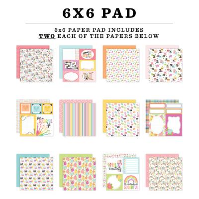 Knallig bunte Kollektion in den Tönen Pink, Hellblau, Hellgrün, Orange und Gelb, die wie Neonfarben wirken. Die Motive bieten alles, was ein gelungener Hobbyraum ausmacht: Kameras, Pinsel, Farben, Nähmaschine, Kleber, Stempel und alles, was ihr fürs Scrapbooking benötigt.