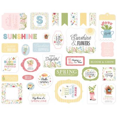 Hübsche Frühlingskollektion mit vielen Blumen, Gartenelementen und Mustern in hellen Rot-, Blau-, Grün- und Gelbtönen.