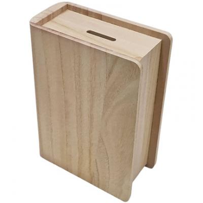 Spardose aus Holz in Buchform.