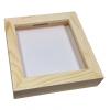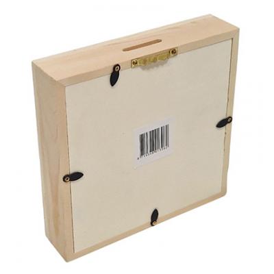 Spardose aus Holz mit Plexiglasfenster und weißer Rückwand.