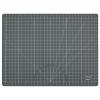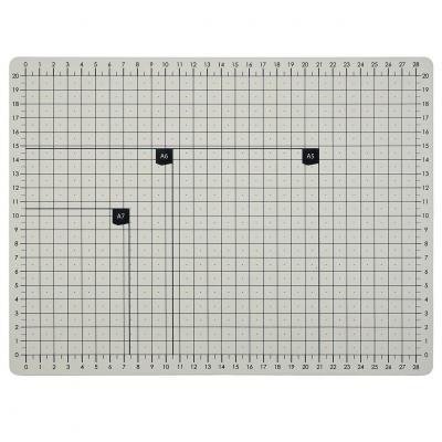 Die Schneideunterlage ist beidseitig bedruckt: Die weiße Seite zeigt Standard-Kartenformate, während die anthrazitfarbene Seite mit Winkelangaben versehen ist. Beide Seiten verfügen über ein Raster mit Zentimetereinteilung.